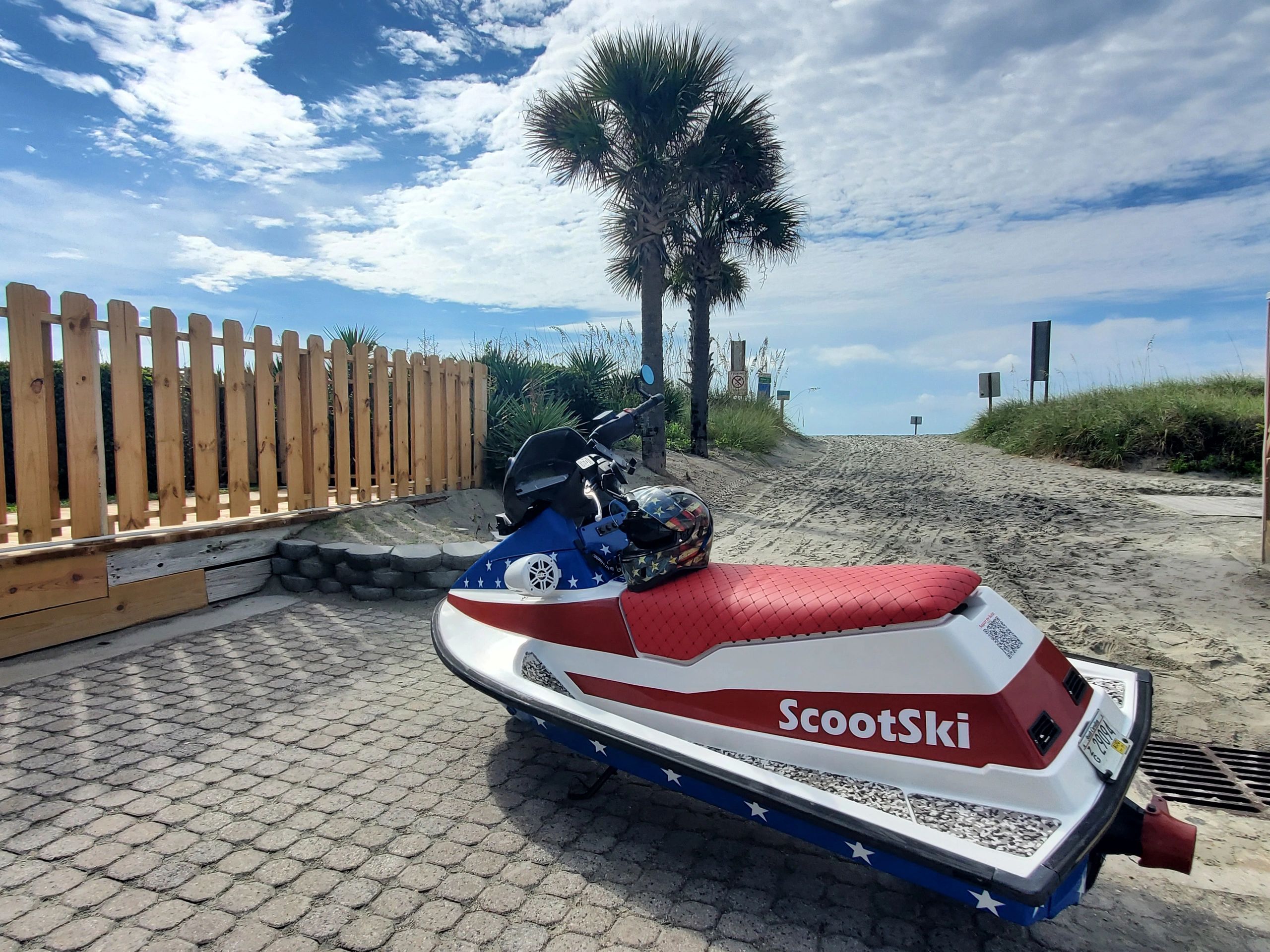 A ScootSki is the holy matrimony of a motorized scooter and a jetski. Murica happens to be built on a Suzuki Burgman 650 with a hollowed out SeaDoo SP hull mounted to the frame. Top speed is said to be about 120mph.